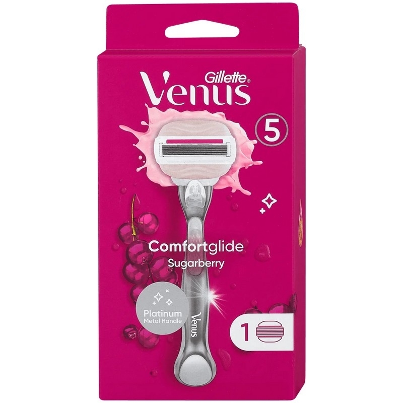Gillette Venus Comfortglide Sugarberry med 5 modstandsdygtige blade, et luksuriøst håndtag og velduftende. For ekstra glatte barberinger!