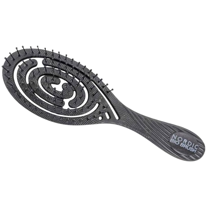 Nordic Bio Brush Sort er lavet af BIO plastik, som fremstilles af sukkerrør og korn. Børsten er derfor 100% genanvendelig. Bio-plastik består af sukkerrør og korn. Sukkerrør er et 100% vedvarende råmateriale, og når man høster en markfuld sukkerrør, kan man straks plante nyt. Bio Brush giver en skånsom og effektiv udredning af håret. Den glider let gennem både vådt og tørt hår uden at rive eller beskadige hårstråene.