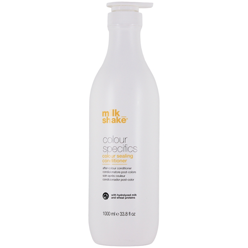 milk_shake Color Specifics Colour Sealing Conditioner 1000 ml er skabt til farvet hår. Den hjælper med at lukke skællaget efter hårfarvning, så farven holder længer og holder sig glansfuld. Indeholder mælkeprotein, som har en stærk plejende virkning. Panthenol og pro-vitamin B5 styrker, plejer og beskytter håret, mens E-vitamin har antioxiderende virkning. Risklidolie har en fugtgivende, blødgørende og nærende virkning på håret. Indeholder tocopherol, oryzanol og tocotrienol, tre beskyttende og antioxidante stoffer, der naturligt virker mod UV-stråler.