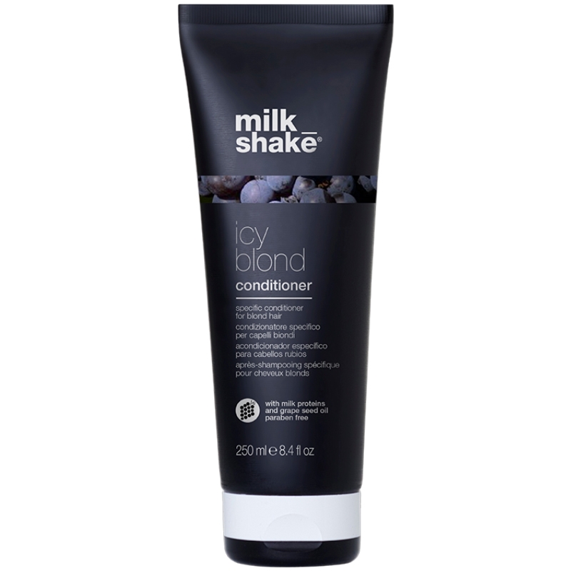 milk_shake Icy Blond Conditioner giver et meget lyst blondt og platin-blondt hår en mere kold ask farve. Den indeholder sorte pigmenter, der neutraliserer uønskede gyldne toner. Håret får en meget mere kold farve efter brug.