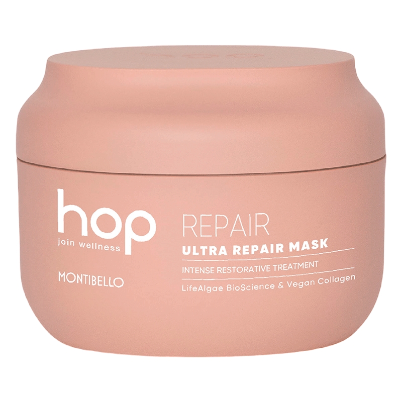 Montibello Hop Ultra Repair Mask er en hårkur til tørt og eller beskadiget hår. Den genopbygger, styrker og reparerer for stærkere, mere modstandsdygtige hår. Beriget med vegansk kollagen, et plantebaseret proteinkompleks, der genopbygger, styrker og genopretter hårfibre, samtidig med at det giver glans, elasticitet og blødhed.