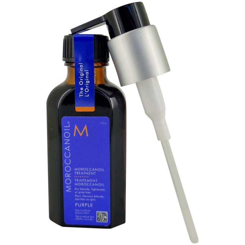 Moroccanoil Treatment Purple 50ml er en plejende hårolie med violette pigmenter som er velegnet til blond, afbleget eller gråt hår. Olien tilfører en kold tone, som neutraliserer gyldne undertoner i gråt eller blond hår. Samtidig tilføres intens pleje, fugt og næring.