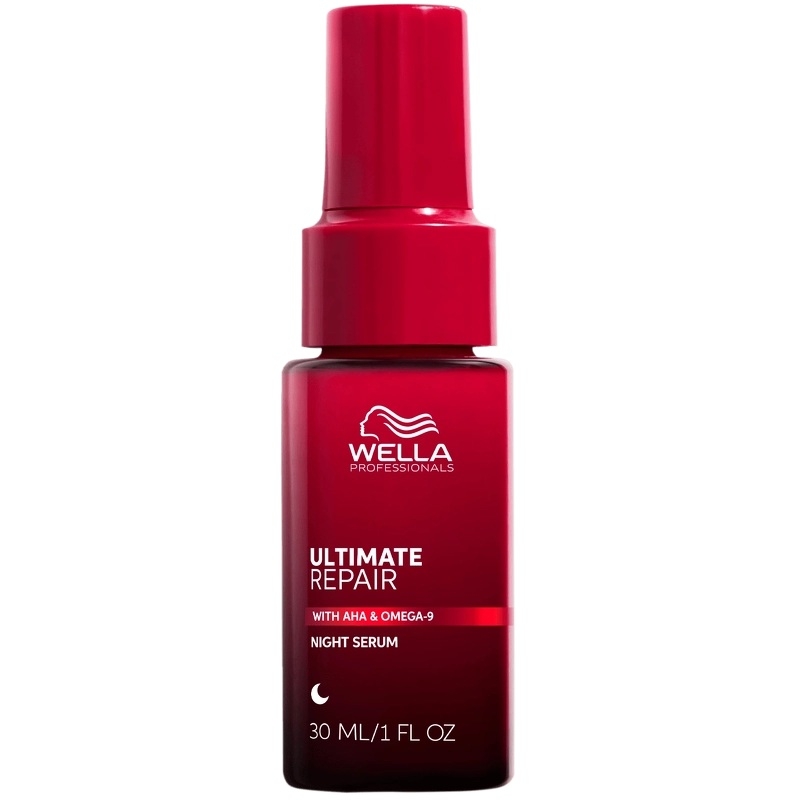 Wella Ultimate Repair Night Serum 30ml -Leave-in overnight serum, som korrigerer mathed, tørhed og ujævnheder. Omega-9 giver intens fugt, forsvarspolymerer beskytter håret mod stress om natten ved at skabe et usynligt skjold. Med AHA, der er kendt inden for hudpleje, bruges i Ultimate Repair til at styrke, pleje og forhindre knækkede hårstrå i sundt og kemisk behandlet hår ved at genopbygge hydrogenbindingerne og trænge dybt ind i hårfibrene. Reparerer skadet hår natten over og giver næring i op til 8 timer. Op til 78 % færre knækkede hår og op til 86 % færre spaltede spidser. Dermatologisk testet, vegansk, dyrevenlig og fri for parabener. Anvend med Ultimate Repair-serien for bedste resultat.