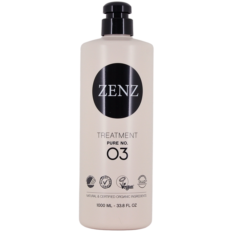 Zenz Pure no. 03 Treatment 1000ml er en mild og effektiv hårkur, der sikrer fugt, styrke og pleje til alle hårtyper - særligt til sart, tørt og skadet hår og sart hovedbund. Den styrker hovedbund og hårsække, og håret efterlades sundt, glansfuldt og silkeblødt. Duftfri kur som beriger hår og hovedbund med proteiner, vitaminer, mineraler og masser af fugt og pleje. Den trænger dybt ind i håret, hvor den blødgør og reparerer håret indefra, så hårstrået forbedres, styrkes og beskyttes. Endvidere er den farvebevarende, så hårfarven holder sig smuk i længere tid.